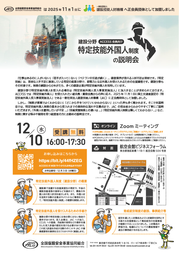建設分野で特定技能外国人を受入れる場合は「特定技能外国人受入事業実施法人」に加入することが求められております。ACCESSでは「特定技能外国人」を受け入れたい組合員・賛助会員からの声に応え、2025年11月1日に国土交通省認定の「特定技能外国人受入事業実施法人」である一般社団法人建設技能人材機構(JAC)に正会員団体として加盟しました。