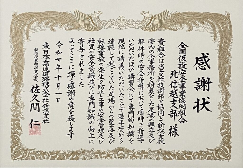 東日本高速道路株式会社(NEXCO東日本)新潟支社(佐久間仁支社長)は、10月10日、足場からの墜落・転落事故を防止し、工事現場の安全管理及び社員の安全意識並びに専門知識の向上に寄与したとして、ACCESS北信越支部(中嶋健博支部長)に対し感謝状が授与され、当支部を代表して寺尾敏志副支部長(藤田金屬株式会社・執行役員)が受けました。