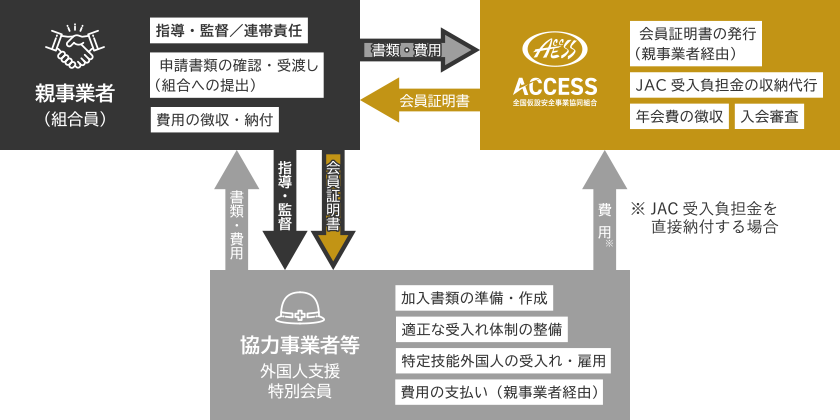 建設分野で特定技能外国人を受け入れるには、一般社団法人建設技能人材機構(JAC)への加盟が必須です。ACCESSでは、JAC加盟に不可欠な「会員証明書」を発行しています。組合員(親事業者)の協力事業者等が、特定技能外国人を受け入れるための「外国人支援特別会員制度」についてご案内します。本制度を利用することで、協力事業者等もACCESSを通じてJAC会員要件(会員証明書取得)を満たすことができます。賛助会員(1種・2種)の協力事業者等は適用されません。