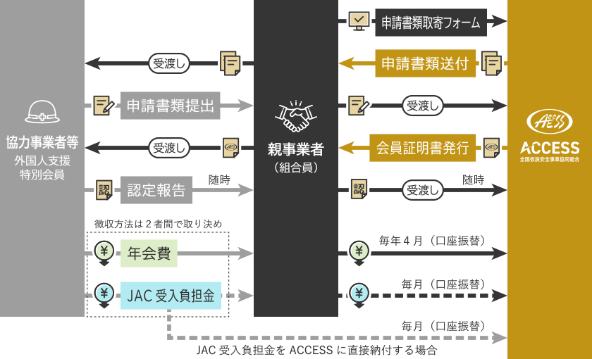 ※2 特定技能外国人の受入企業は、JACが行う教育訓練等の共同事業の活動原資として、JACが定める受入負担金を支払う必要があります。ACCESSはJACへ支払う収納代行を行っています。JACへ直接お支払いすることはできません。支払い遅延や未納が発生した場合、JACと国土交通省に情報が共有されます。その結果、特定技能での「受入認定が取り消し」となりますので十分ご注意ください。